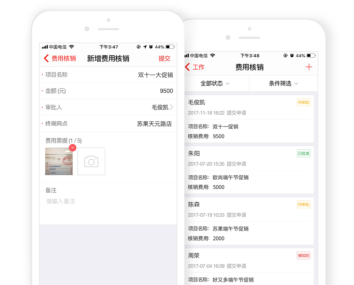 随时随地通过手机App、微信小程序、企业微信等多种方式提交费用核销申请,对费用单据进行拍照,既方便快捷又真实有效。